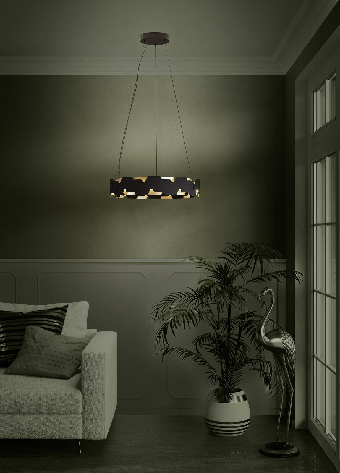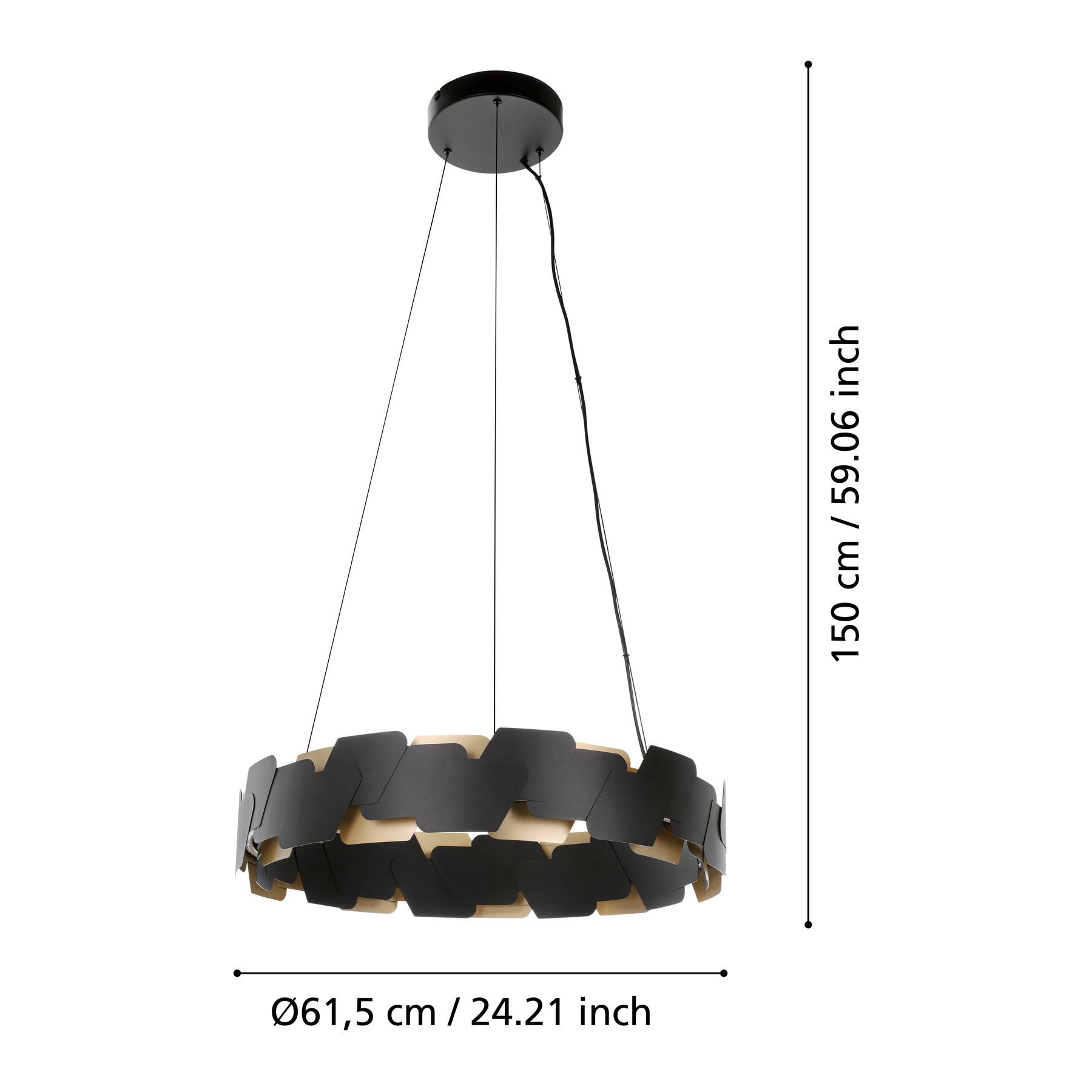 Závěsné LED svítidlo ALTAGRACIA je vyrobeno ze zavěšeného kovového těla prstencového tvaru, které se skládá z odsazených plochých prvků ve zlaté a černé barvě. Integrované LED mezi geometrickými kovovými prvky poskytují příjemné teplé bílé světlo směrem nahoru i dolů a lze je stmívat pomocí vhodného otočného stmívače na stěně. Závěsné svítidlo se hodí do moderních stylů bydlení a nabízí speciální poutač v obývacím pokoji nebo jídelně nad jídelním stolem.