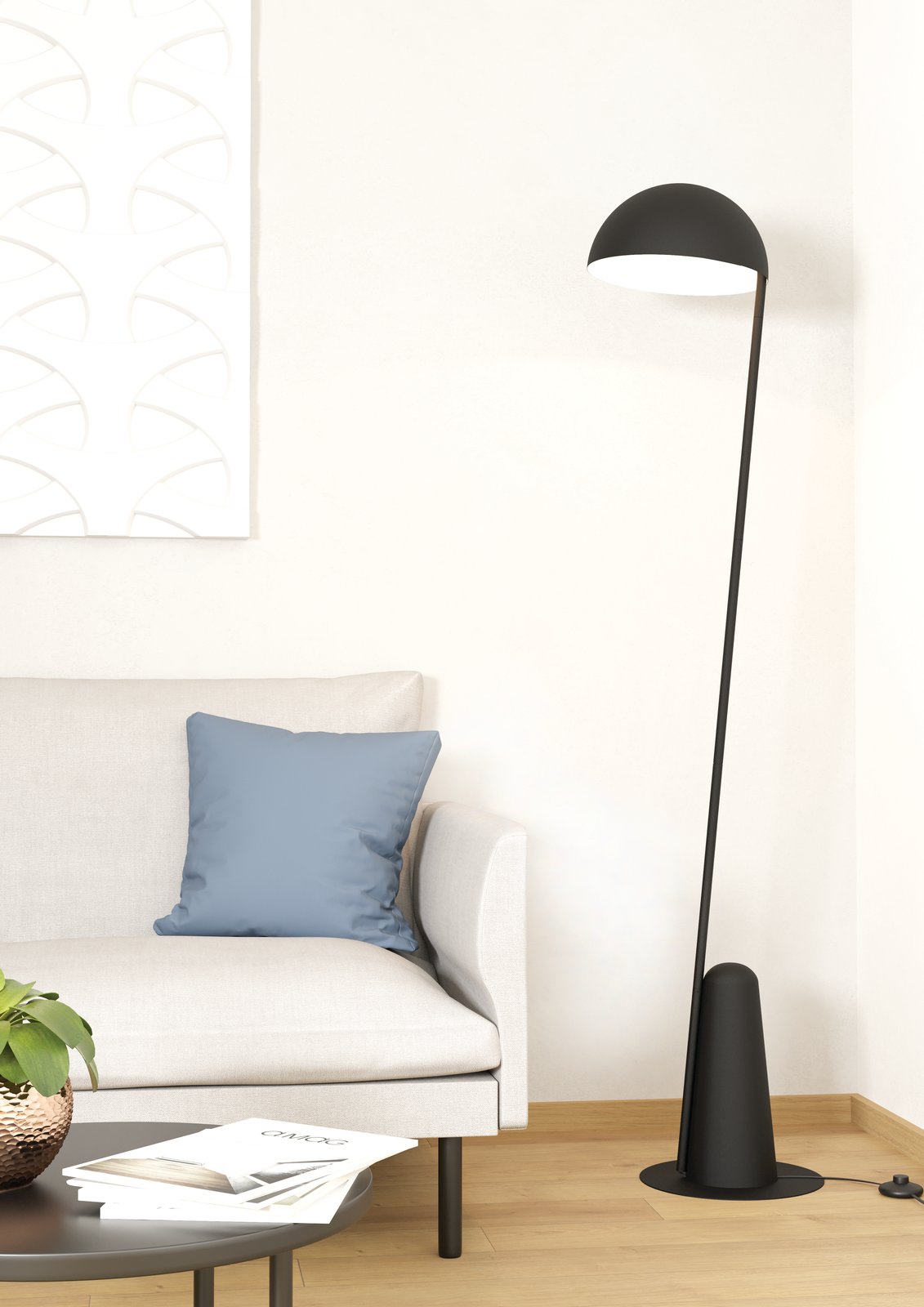 Stojací lampa ARANZOLA se skládá z černého, jemného kovového těla lampy, které je připevněno k zaoblené, kuželovité základně lampy. Hlavu lampy tvoří miskovité stínidlo v černé barvě s bílým vnitřkem. Stojací lampu lze snadno zapnout a vypnout pomocí nožního spínače na kabelu. Stojací lampa v minimalistickém designu nabízí moderní osvětlení do vašeho pokoje – ať už do obývacího pokoje, ložnice nebo jídelny. Lampa není součástí dodávky. Lampa je vhodná pro jakoukoli žárovku s paticí E27.